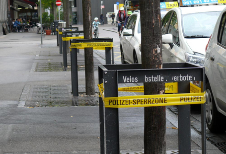 Ob die gut einen Quadratmeter grossen Sperrzonen den Bäumen gelten, ist möglich, aber eher unwahrscheinlich. Vielmehr dürften sie ein ironischer Hinweis auf die notorische Not an Veloabstellplätzen um den Basler Bahnhof sein, an dem auch die Benützung von Baumschutz-Einrichtungen zur Sicherung gegen Fahrrad-Diebstahl nicht erlaubt ist.