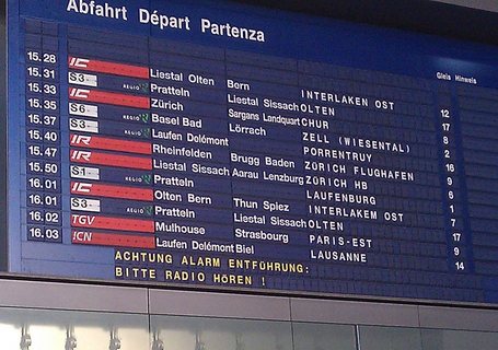 Achtung, Bahn-Alarm. Jetzt hat das Mickey Mouse-Syndrom (OnlineReports berichtete in zunehmender Kadenz darüber) auch die Hauptanzeigetafel in der Schalterhalle des Bahnhofs SBB in Basel befallen. Heute Sonntagnachmittag entdeckte "Radio Basel"-Redaktor Samuel Hufschmid einen authentischen Entführungs-Alarm auf dem Bähnler-Tableau. Auch über Lautsprecher wurde auf eine Entführung hingewiesen. Kurze Zeit später war die Alarmmeldung wieder von der Anzeigetafel verschwunden. Doch jetzt folgts noch dicker, wie "Radio Basel" herausfand: Laut SBB-Sprecher Roman Marti sei der Alarm aufgeschaltet worden, weil versehentlich eine Vermisstmeldung aus dem Kanton Zürich eingegeben worden sei. Trost: Der Entführungs-Alarm erfolgte auf eine Vermisstmeldung – und nicht auf das kürzlich Treffen von SBB-Chef Andreas Meyer mit Bundesrätin Doris Leuthard.