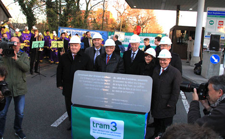 Der Spatenstich wurde mit der Enthüllung einer Erinnerungstafel gefeiert, die nach Abschluss der Arbeiten definitiv an der neuen Tramstation Basel-Burgfelden Grenze zwischen die Tram-Schienen gelegt werden soll. Der Basler Regierungsrat Hans-Peter Wessels, der Präsident der Communauté de Communes des Trois Frontières, Alain Girny, der Maire von Saint-Louis, Jean-Marie Zoellé, BVB-Direktor Erich Lagler und die Geschäftsführerin der IBA Basel 2020, Monica Linder-Guarnaccia, betonten am heutigen Spatenstich die Wichtigkeit des Ausbaus der öffentlichen Verkehrsmittel in der Agglomeration und besonders die Bedeutung der Verlängerung des Trams 3 als Meilenstein in der grenzüberschreitenden Zusammenarbeit zwischen der Schweiz und Frankreich.