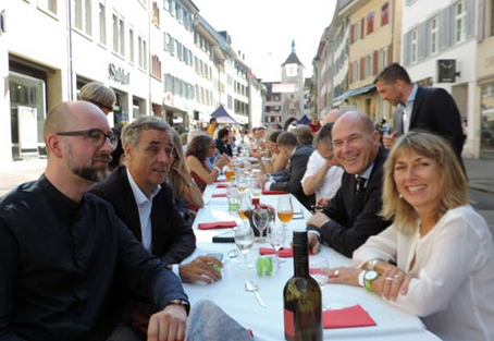 Unter grosser Medienpräsenz wurde vor zehn Tagen mit dem Liestaler Stadtpräsidenten Lukas Ott und Bundesrat Guy Parmelin die "Baselbieter Genusswoche" eröffnet. Bei strahlendem Herbstwetter endete heute Sonntag die Veranstaltung in der beflaggten Rathausstrasse mit der langen Tafel: 70 Tische für je zehn Personen waren gedeckt – und besetzt. Ein herrliches Baselbieter Menü von Catering-Chef Toni Brüderli mit feinem Baselbieter Wein erfreute die Gäste und auch Organisator Tobias Eggimann, Geschäftsleiter von Basleland Tourismus.