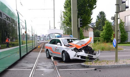 Bei der massiven Kollision eines Polizei-Patrouillenfahrzeugs mit einem Tram wurden heute Samstagmorgen in Muttenz zwei Baselbieter Polizisten verletzt. Der Zusammenstoss ereignete sich kurz vor 6.50 Uhr auf der "Rennbahn-Kreuzung". Das Polizei-Auto war vom Sportplatz "Margelacker" her unterwegs auf einer dringlichen Einsatzfahrt zu einem Einbruchalarm unweit der "Rennbahn-Kreuzung". Die beiden Polizisten, die sich im Fahrzeug befanden, zogen sich primär Prellungen und Verspannungen zu.