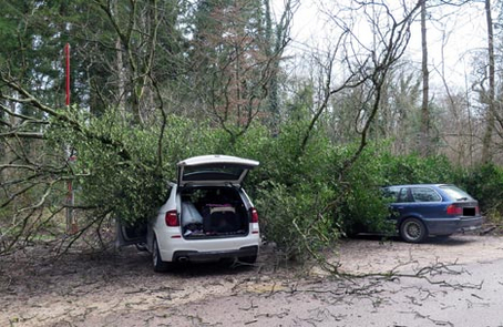 Der markanteste Schaden entstand gegen 14 Uhr an der Rheinfelderstrasse in Muttenz, die zum "Waldhaus" führt. Dort stürzte ein kräftiger Baum auf zwei parkierte Personenwagen, die beide stark beschädigt wurden (Bild).