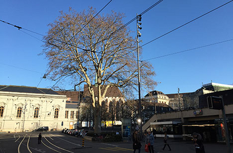 Wer sich in dieser Jahreszeit an der Tramhaltestelle "Theater" aufhält und Richtung Steinenberg blickt, dem fällt der Baum kaum auf: Ein Stamm und laubloses Geäst. Doch wenn im Frühling das Blattwerk austreibt, dann wird das Spektakuläre sichtbar: Eine immense Platane mit mächtiger Krone und einem Stammdurchmesser von mehr als einem Meter.