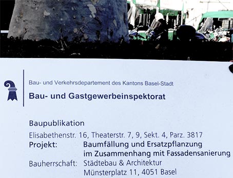 Konfrontiert mit der vor dem Baum aufgestellten Baupublikation sagte Yvonne Aellen, da sei "offenbar ein Fehler bei der Platzierung des Schildes passiert", und sie stellt richtig: "Für die grosse Platane ist kein Fällgesuch hängig. Meines Wissens läuft eine Publikation zu einem kleineren Baum oberhalb des Theaters bei der Liegenschaft Elisabethenstrasse 16." Bei Bedarf sei eine Planeinsicht zu diesem Baubegehren, wie auf dem Schild vermerkt, beim Bau- und Gastgewerbeinspektorat möglich.