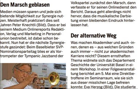 ![]() Knapp daneben gespöttelt: Die "Schweiz am Sonntag"Basel, 19. April 2015Dass der Basel-Bund der "Schweiz am Sonntag" die führende und einzige Wochen-Bezahlzeitung der Region Basel ist, ist allgemein bekannt. Weiterführende Links: "Der 'Schweiz am Sonntag' voraus" OnlineReports ist halt der SaS – oder wie kürzt sich diese Zeitung schon wieder ab? – einfach voraus. Nicht nur jeden Tag an der Information, sondern auch noch Vorspieler der SVP. Das sollen sie zuerst einmal nachmachen. Und wo Bruno Heuberger recht hat, da hat er einfach recht. Ruedi Mohler, Oberwil "Eifach la bambele!" Denke, jede Zeile zu erwähntem Blatt, ist eine zuviel. "Eifach la bambele!" Monika Stucki, Seltisberg "Schon bedenklich" Es ist schon bedenklich, wie schludrig heutzutage gewisse "Journalisten" Vermutungen in der Öffentlichkeit verbreiten statt richtig zu recherchieren. Auch so wird eine Zeitung unglaubwürdig, als hätte es nicht schon genügend Gazetten mit "Blick"-Niveau. Bruno Heuberger, Oberwil |