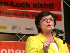SP-Ständerat Anita Fetz (Bild) bezeichnete die schweizerische Unternehmenssteuerreform II, die das Basler Sparpaket auslöste, als eine "Mogelpackung". Von der Reform profitierten die Grossunternehmen, dafür bluten müssten jetzt die gewöhnlichen Bürger, Angestellten und Kleingewerbler. Dabei habe Basel-Stadt die Steuerreform mit 58 Prozent Nein-Stimmen abgelehnt. Dies müsse eine "demokratische Verpflichtung für das Basler Parlament" sein, forderte Fetz. Sie sei nicht gegen das Sparen, aber "nicht auf Kosten der Ärmsten, sondern mit sozialem Augenmass". Vielmehr sei es angebracht, den Staatsangestellten "Wertschätzung" zu zollen.