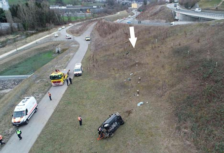 Gravierender Selbstunfall heute Freitagmorgen früh auf der kantonalen Autobahn A22 in Füllinsdorf. Ein 43-jähriger Personenwagenlenker fuhr kurz nach 1.30 Uhr von Liestal herkommend in Richtung Pratteln. Vor der Ausfahrt Pratteln verpasste er die Linkskurve und fuhr geradeaus, durchbrach einen Wildschutzzaun und flog mit seinem Fahrzeug mehrere Meter durch die Luft (Pfeil). Anschliessend überschlug sich das Auto in einer Böschung mehrfach und kam auf der Seite liegend zum Stillstand.