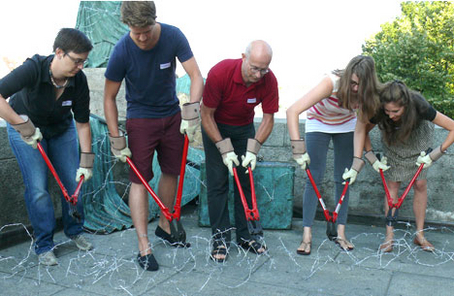 ![]() Mit dem Bolzenschneider für eine linke Grossrats-MehrheitDas Grüne Bündnis will an den Wahlerfolg bei den Nationalratswahlen anknüpfen und für eine linke Mehrheit auch im Basler Grossen Rat kämpfen. Zum Wahlauftakt packte es Bolzenschneider und Stacheldraht aus.Basel, 16. August 2016Die Bronzeplastik "Helvetia auf der Reise" von Bettina Eichin am Kleinbasler Brückenkopf war heute Dienstagmorgen mit Stacheldraht verhüllt. Und nun griffen fünf Grossrats-Kandidierende* zu Handschuhen und Bolzenschneidern und trennten das Drahtwerk in Stücke. Die Aktion von "Basta"-Kopräsidentin Tonja Zürcher, "Basta"-Mitglied Nicola Goepfert, Grossrat und Grüne-Kopräsident Harald Friedl, Eva Strub vom Jungen Grünen Bündnis und der grünen Grossrätin Nora Bertschi soll das Wahlprogramm der beiden zum Grünen Bündnis zusammengeschlossenen Parteien symbolisieren: Grenzen und Gedankengefängnisse sprengen. Weiterführende Links: ![]() "Eigene Gedankengefängnisse sprengen" Wer’s glaubt!... Schön wär's, wenn die Grünen endlich mal auch ihre eigenen Gedankengefängnisse sprengen würden: Für den heiligen OeV zum Beispiel wurden mit Unterstützung der Grünen zugunsten der Verlängerung der 3-er-Tramlinie nach St. Louis diskussionslos 82 Bäume geopfert, beim Margarethenstich der Linie 17 werden es 12 sein. Bei letzterem Beispiel haben die Grünen BL immerhin noch die Gelegenheit, gegen diese Landschafts-zerstörende und den Basler Bahnhofplatz mit Tram-Stau eindeckende Tramlinie das Referendum zu ergreifen. Im Basler Grossen Rat wurde dieser Blödsinn – mit Hilfe der Grünen – bereits durchgewinkt. Dieter Stumpf, Basel |