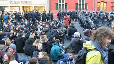 Am Rande des Platzes sammelten sich gegen zweihundert Jugendliche zu einem fröhlichen Sit-in, an dem sich witzige Transparente und Sprechchöre ("Frikadellen", "Freibier für die Polizei") mit politischen ("siamo tutti antifascisti") und flüchtlingsfreundlichen Parolen abwechselten. Zuvor hatte ein fremdenfeindlicher Basler Grossrat den Versammelten aus dem Fester des Rathauses "Hallo-Hallo" zugerufen, was diese mit Pfiffen quittierten.