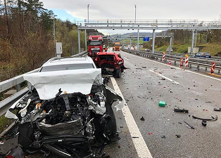Mit hoher Geschwindigkeit näherte sich sodann ein "Porsche Cayenne" der Baustelle. Dessen Lenker schwenkte vom Überholstreifen nach rechts und streifte dabei zunächst einen Sattelschlepper. In der Folge prallte der Wagen mit grosser Wucht in das Heck eines roten "Renault Kadjar". Dieser wurde nach vorne ins Heck eines Anhängerzuges geschoben und zwischen den beiden Fahrzeugen zerquetscht.