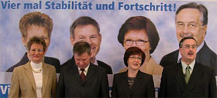 ![]() Wahlen im Baselbiet: Gemeinsames Lächeln für den Sieg der bürgerlichen AllianzErstmals präsentierten sich an einer gemeinsamen Medienkonferenz in Liestal die vier Kandidatinnen und Kandidaten der "Bürgerlichen Zusammenarbeit" (Büza) für die Baselbieter Regierungsratswahlen von Ende März (v.l.n.r.): Die neue Freisinnige Sabine Pegoraro und die Bisherigen Erich Straumann (Volkswirtschafts- und Sanitätsdirektor, SVP), Elsbeth Schneider (Bau- und Umweltschutzdirektorin, CVP) und Finanzdirektor Adrian Ballmer (FDP).Liestal, 5. Februar 2003"Vier mal Stabilität und Fortschritt" heisst der gemeinsame Slogan-Nenner, der durchaus Anlass zu tiefen philosophischen Debatten geben mag. Die vier Bewerberinnen und Bewerber, die sich im politischen Alltag wohl gelegentlich auch die Zähne zeigen, präsentierten sich allesamt als loyale und erst noch geschlechterparitätische Teamplayer, die Gewähr gegen die "momentane Katerstimmung im Kanton" (so Pegoraro) und das "verschlechterte Klima zwischen Parlament und Regierung" (Ballmer) seien. |