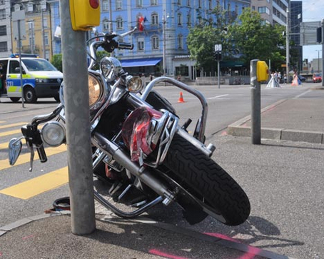 Nachtrag vom 12. Augst 2015. Die bisherigen Abklärungen durch die Verkehrspolizei ergaben, dass der Motorradlenker mit dem Randstein einer Verkehrsinsel kollidierte, die Kontrolle über sein Fahrzeug verlor und anschliessend zuerst in einen Pfosten und danach in eine Ampel prallte. Der Unfallhergang mit dem Personenwagen wird nach wie vor abgeklärt.