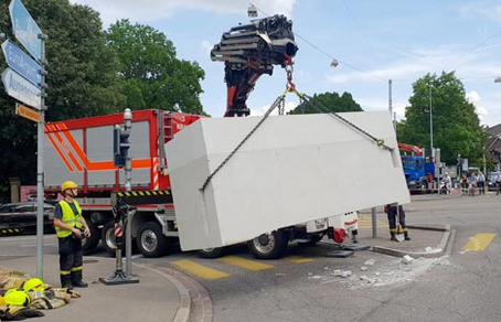 Die Ursache des Unfalls ist offen. Es entstand Sachschaden am Betonelement sowie auf der Strasse. Verletzt wurde niemand. Die Basler Berufsfeuerwehr barg den Brocken mit einem Kranwagen.