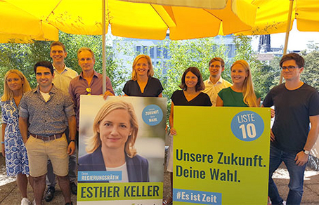 ![]() Grünliberale: Eine Alternative zu links und zu rechtsSechs Sitze im Parlament und damit Fraktionsstärke erreichen, ist das erklärte Ziel der Grünliberalen und natürlich Esther Keller in den Regierungsrat hieven. Sie setzen auf ihr eigenes Programm und heben ihre Stärken hervor.Basel, 21. August 2020Die Grünliberalen vermeiden persönliche Angriffe auf politische Gegner, auch wenn in ihren Reden klar wird, gegen wen der Angriff zielen könnte. Esther Keller betont ihre Transparenz, ihren Führungswillen und auch ihre Kommunikation. "Damit bin ich eine Alternative!", erläutert die Regierungspräsidiums-Kandidatin. Sie spricht klar, schnell und mit Nachdruck, der ihre Überzeugung unterstreicht. "Dinge, die nicht stimmen – das darf nicht sein", sagt sie zum Bericht der grossrätlichen Geschäftsprüfungs-Kommission über die Rolle des Präsidialdepartements in den Wirren um das Historische Museum Basel. "Alte Rezepte genügen den neuen Herausforderungen nicht", macht sie den Bisherigen, die mehrheitlich bewahren wollen, Dampf.