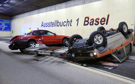 Ein Selbstunfall, der leicht schwerwiegendere Folgen hätte haben können, ereignete sich heute Freitagmorgen im Chienberg-Umfahrungstunnel in Sissach. Ein 40-jähriger Lenker fuhr mit seinem Auto und einem Anhänger, auf dem ebenfalls ein Personenwagen geladen war, kurz nach 10.15 Uhr in Fahrtrichtung Liestal in den Chienberg-Tunnel ein. Aus noch unbekannten Gründen schaukelte sich der Anhänger im Tunnel auf. Unmittelbar vor der "Ausstellbucht 1" geriet die Fahrzeug-Kombination ins Schlingern und das Zugfahrzeug überschlug sich seitlich. Der Anhänger wurde dabei abgerissen und der geladene Personenwagen vom Anhänger geschleudert. Der Lenker musste ins Spital eingeliefert werden. Der Chienberg-Tunnel blieb für rund zweieinhalb Stunden komplett gesperrt.