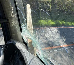 Zeitgleich näherte sich auf der Gegenfahrbahn ein Lastwagen. Als sich die beiden Fahrzeuge kreuzten, bohrte sich der Holzbalken durch die Frontscheibe des Lastwagens in dessen Armatur (Bild). Der Lastwagenfahrer blieb glücklicherweise unverletzt und kam mit dem Schrecken davon.