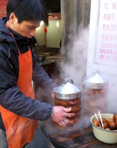 Untergrundbahnstation Yong Anli und eilen zu ihren Arbeitsplätzen in den CBD-Hochhäusern. Ein gutes Dutzend Strassenköche warten auf Kundschaft. Von Teigstangen im heissen Öl frittiert über Pfannkuchen bis hin zu Baozi und heisser Soya-Milch gibt es alles, was das chinesische Frühstücksherz begehrt. Günstig, billig, lecker.